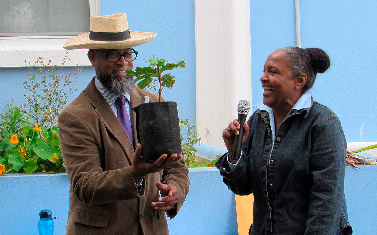 Santucci shows Bermuda’s Minister of Health and Seniors Jeanne Atherden some of his seedlings, on the grounds of Hamilton’s Youth Library in Hamilton, Bermuda. Image by Kevin Santucci