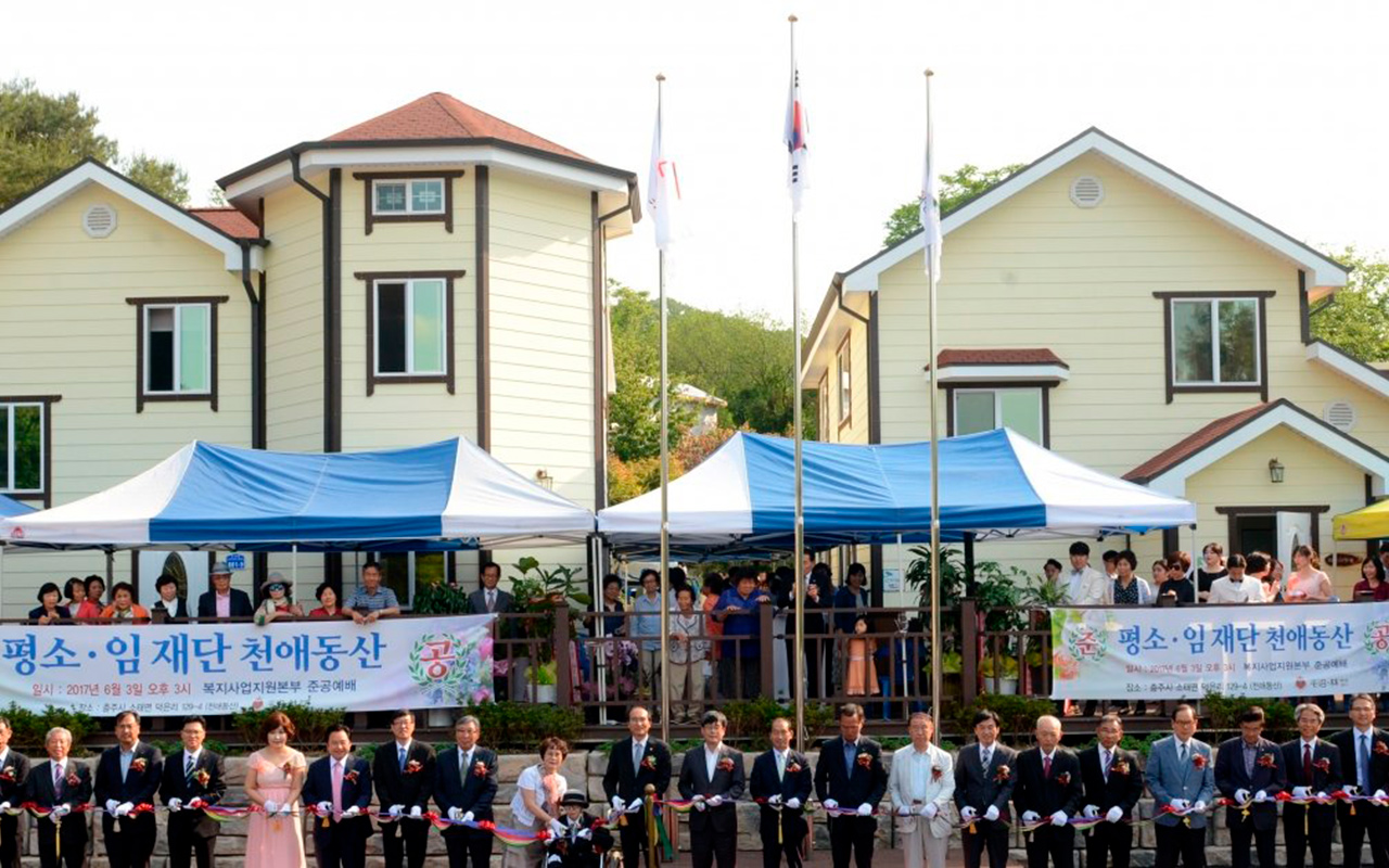 The Hiranuma & Hayashi Foundation, a nonprofit organization, opened the “Cheon Ae Garden” new welfare center in Chungju, Korea, with a special dedication service on June 3. Up to seven mothers can stay at a residence in the center, which is equipped with a kitchen, a living room, a bathroom, and a playroom. Mothers and children who need help can be safely protected within the premises.