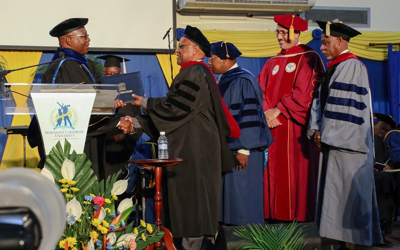Northern Caribbean University (NCU) conferred an Honorary Doctorate of Divinity Degree on Pastor Leon B. Wellington during the institution’s 94th Commencement (Graduation) ceremonies on campus in Mandeville, Jamaica, Aug. 13, 2017. Wellington, who recently retired from serving as vice president of the Inter-American Division (IAD), was honored for his service to religion and his contribution to Jamaica.