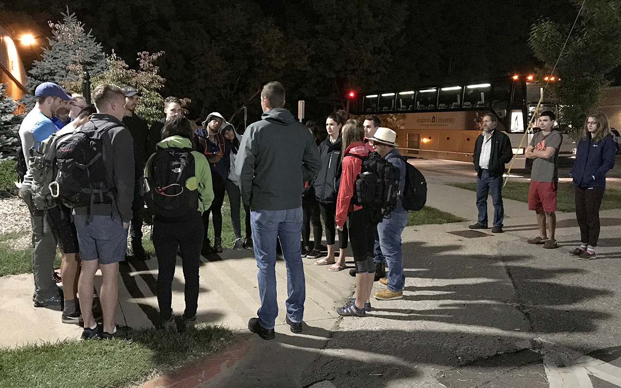 Architecture students gather for prayer as they prepare to depart for Puerto Rico from the architecture building parking lot early Sunday morning, Oct. 1. Image by Troy Homenchuk, Andrews University News