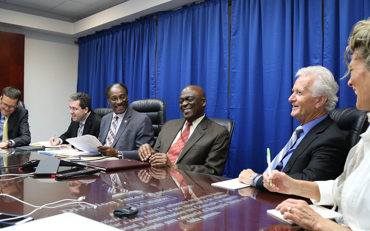 Left to Right: Kenneth Weiss, MVI executive vice president, Pastor James Daniel, IAD vice president, Pastor Israel Leito, IAD president, Don Noble, MVI president, and wife Laura Noble review rebuilding needs across the Caribbean during a meeting held at the IAD Headquarters in Miami, Florida, Nov. 13, 2017. Image by Libna Stevens/IAD