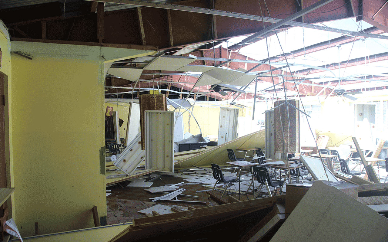 Damage to a room at the St. Thomas/St. Johns Adventist Church in St. Thomas. Image Courtesy of North Caribbean Conference