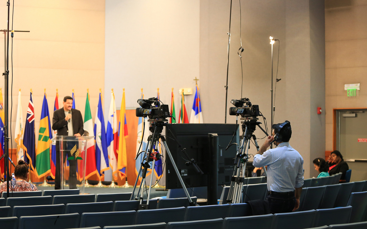 Pastor Al Powell, youth ministries director for the church in Inter-America explains the special OYiM training segment during the online program Apr. 28, 2018, held in Miami, Florida. Image by Keila Trejo/IAD