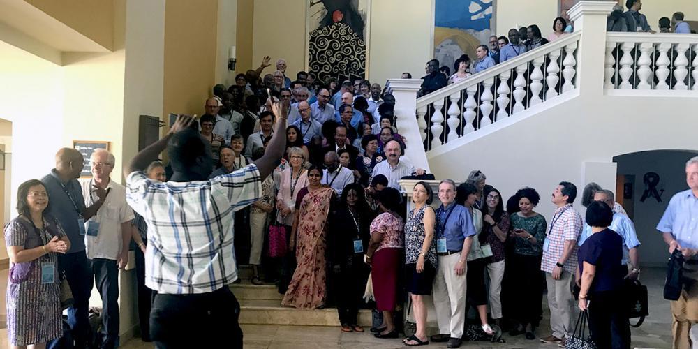Attendees of the 12th Global Leadership Summit prepare to take a group photo on the stairs of a hotel in Montego Bay, Jamaica, on February 6, 2019. Photo by Andrew McChesney, Adventist Mission