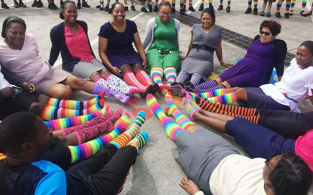 Teachers at the St. Maarten Seventh-day Adventist School bring show their colorful silly socks during the World Down Syndrome Day, held Mar. 21, 2019. Teachers and students took the day to learn more about the disorder and collected $1 dollar each to assist the Sister Basilia Center which houses several children with Down Syndrome. Photo: St. Maarten Adventist School