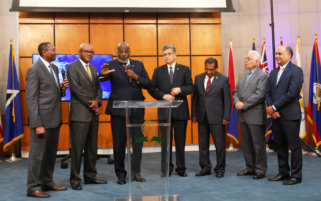 Inter-American Division leaders stand next to by Pastor Elie Henry (third from left), president, encourages thousands of pastors to double efforts in sharing the gospel and baptizing more members into their local congregations, during the church’s Online Evangelism Summit for Pastors held June 4, 2019, in Miami, Florida, United States. Photo by Libna Stevens/IAD