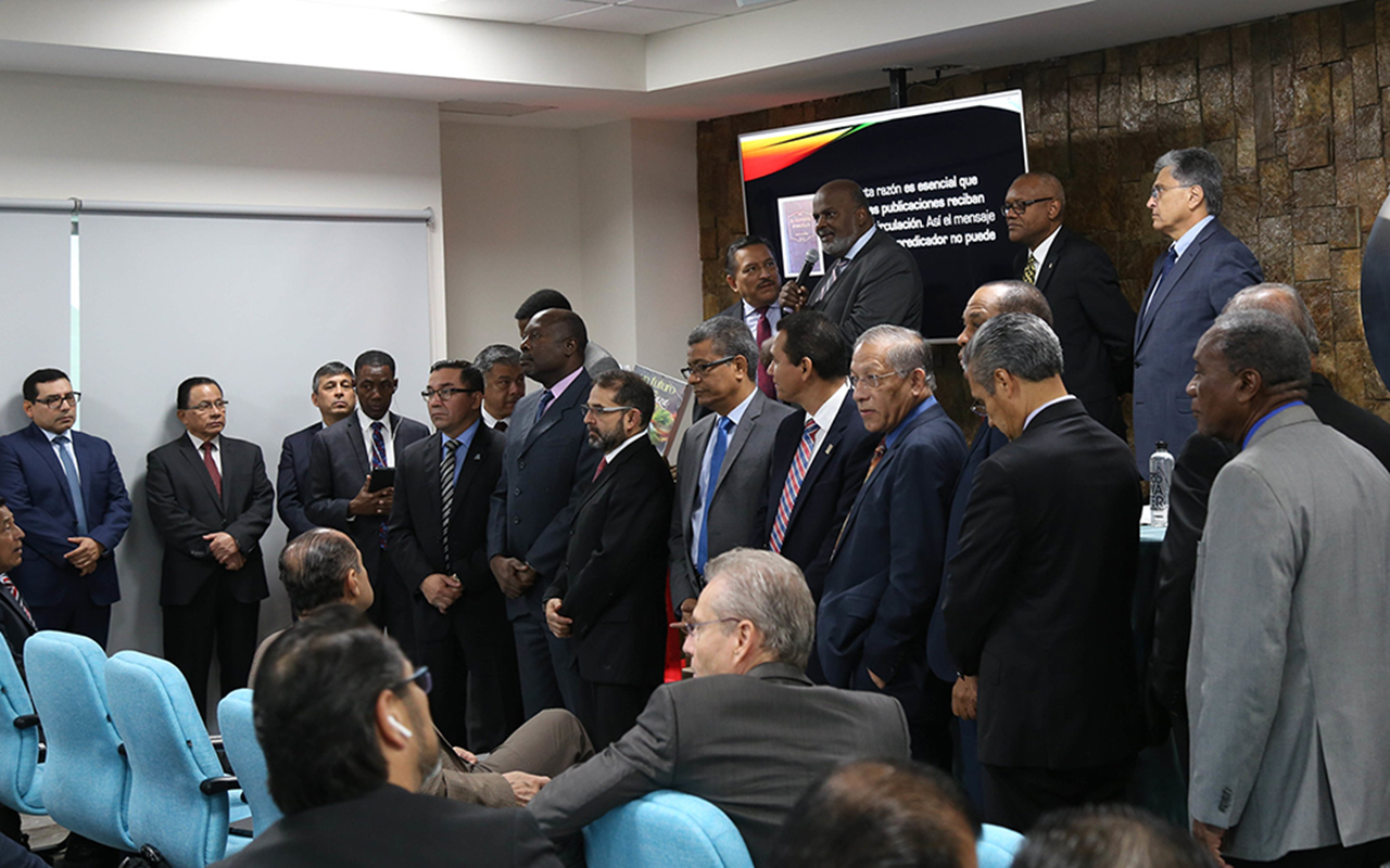 IAD President Pastor Elie Henry speaks alongside union presidents before the committee pauses to pray for the 10 million missionary books entitled “Hope Beyond Tomorrow” by Mark Finley, which will be distributed across the territory in 2020. Photo: Libna Stevens/IAD