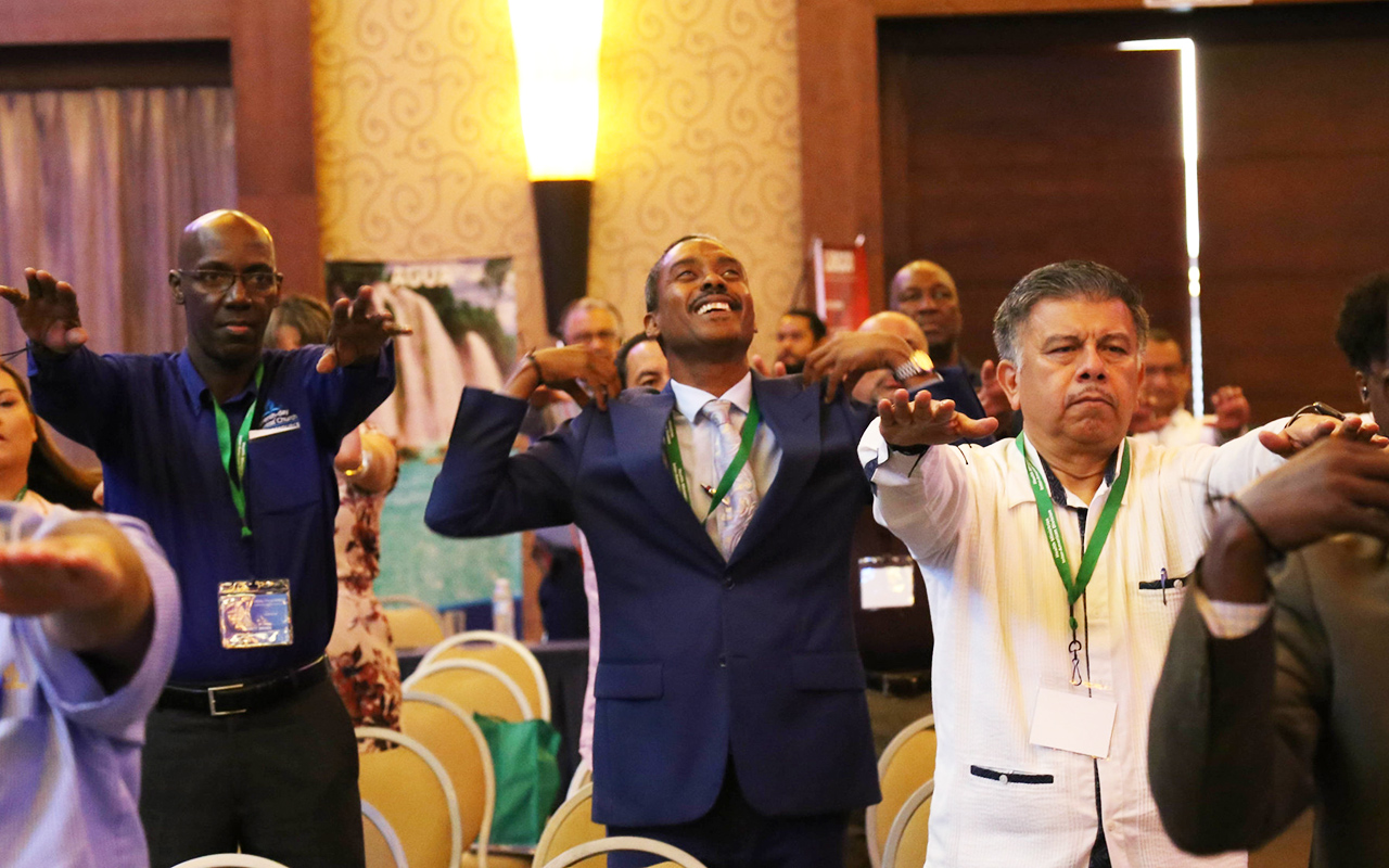 Seventh-day Adventist leaders in Inter-America take part in stretching and breathing exercises during day two of the territory-wide health summit held this week in Punta Cana, Dominican Republic, Jan. 23, 2020. [Photo: Libna Stevens/IAD]