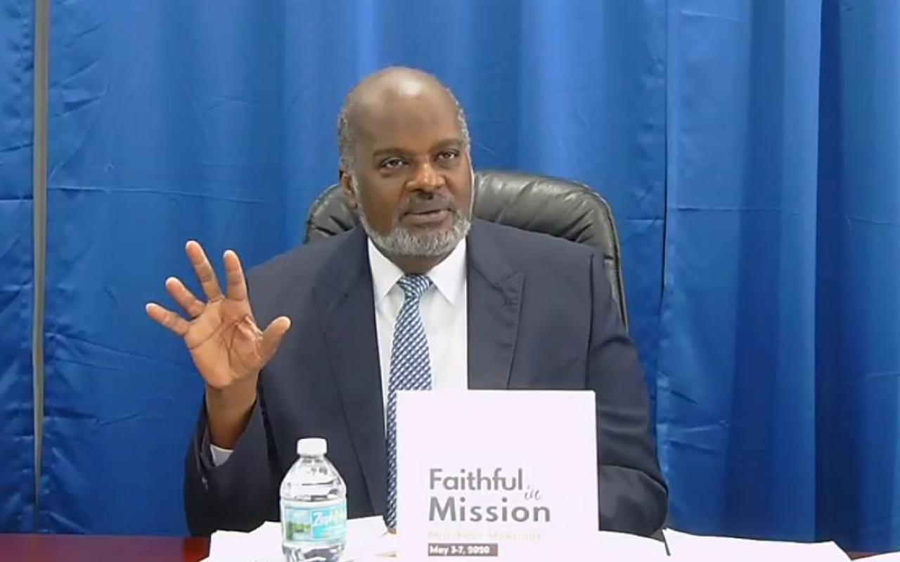 Inter-American Division President Pastor Elie Henry speaks to top executive committee meetings on video conference during the strat of the church’s annual mid-year business meetings from Miami, Florida, United States, May 6, 2020. [Photo: Abel Márquez/IAD]