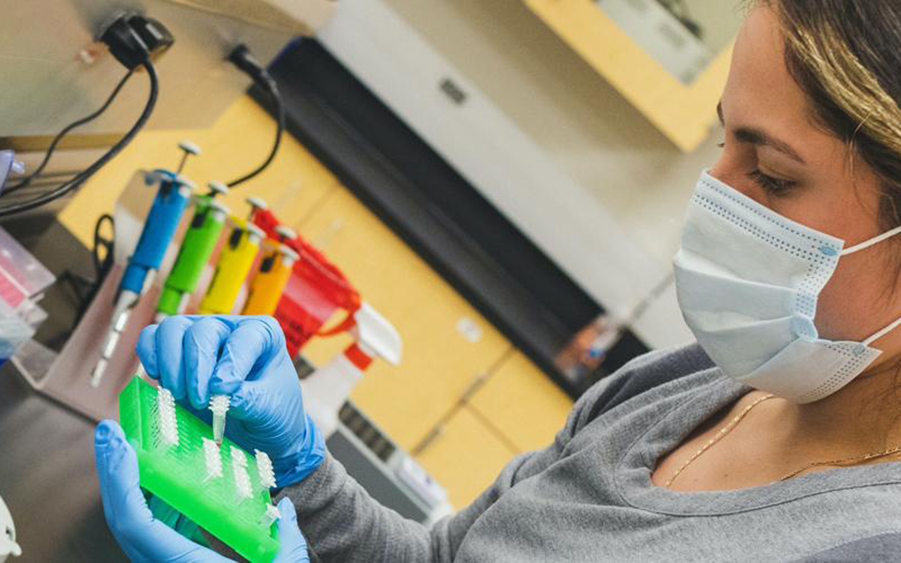 Daisy Pineda, a staff member in Arturo Diaz’s lab, processes saliva samples for COVID-19 screening tests. [Photo: Natan Vigna, La Sierra University News]