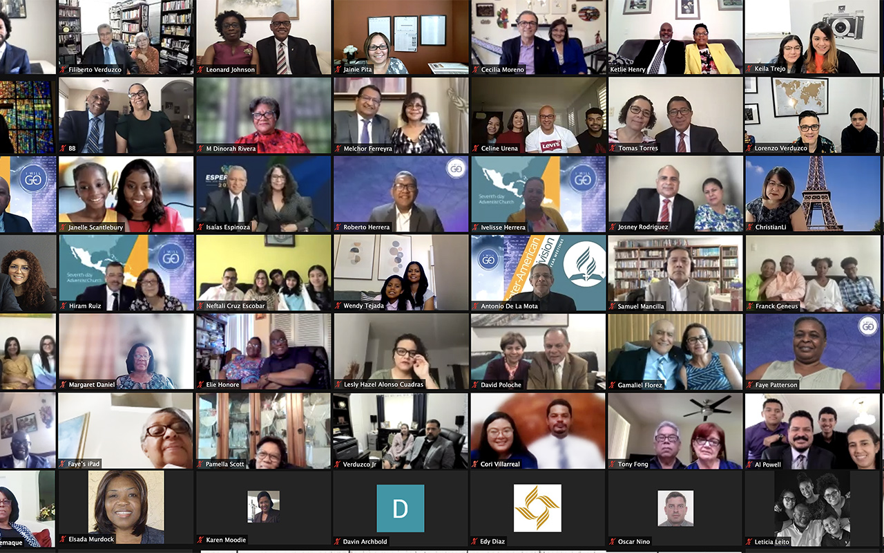 Seventh-day Adventist leaders, staff and their families pose for a zoom photo during the Sabbath program which concluded the annual week of spiritual emphasis for the Inter-American Division office, held May 10-15, 2021. [Photo: IAD Screenshot]