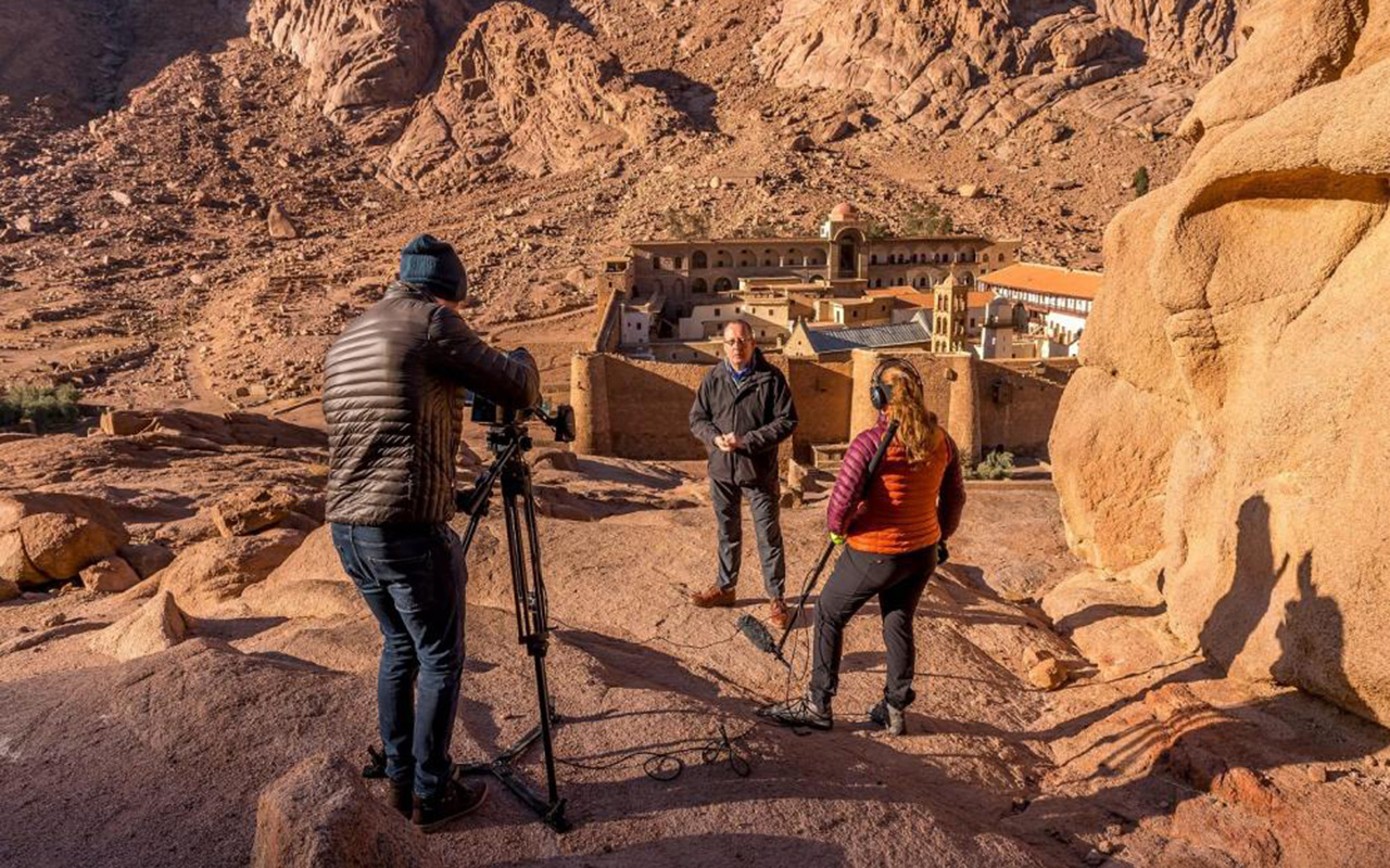 The Codex Sinaiticus crew filming at the foot of Mount Sinai with English-language host Victor Hulbert. [Photo: Trans-European Division News]