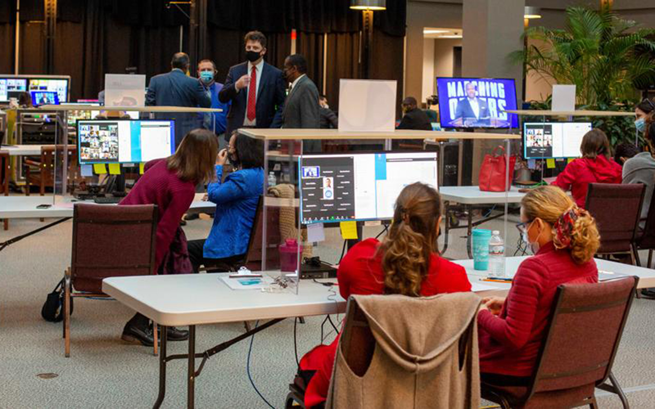 Zoom coordinators help to ensure everyone can see and participate at the 2021 Annual Council. [Photo: Brent Hardinge, Adventist Exchange Media (CC BY 4.0)]