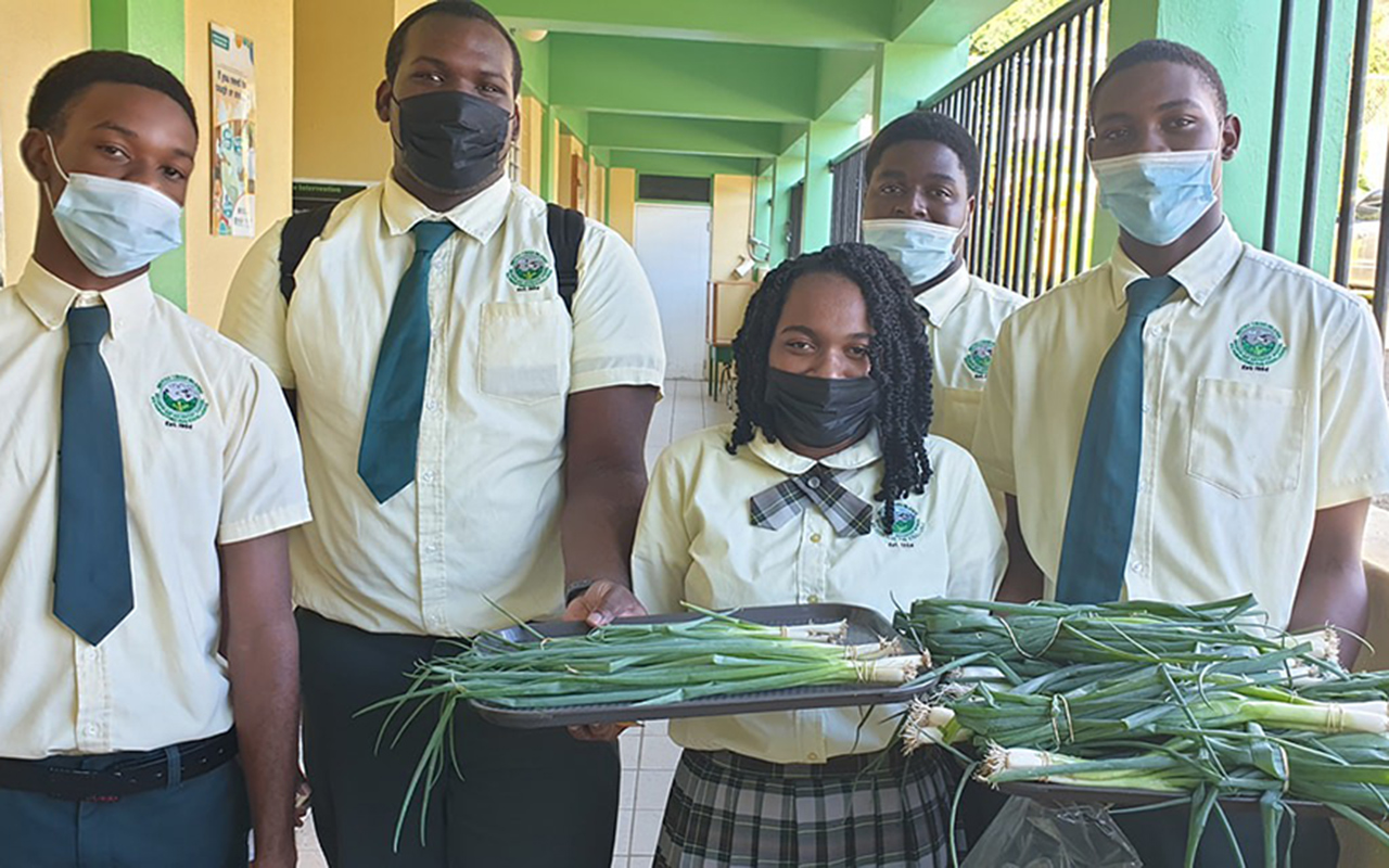 A group of seniors show the green onions they have grown at the British Virgin Islands Seventh-day Adventist School on the Island of Tortola. The Adventist school has implemented planting activities for primary students and an agricultural science course for students 7 to 12th graders to sell in the community and raise funds for the program. [Photo: BVI SDA School]
