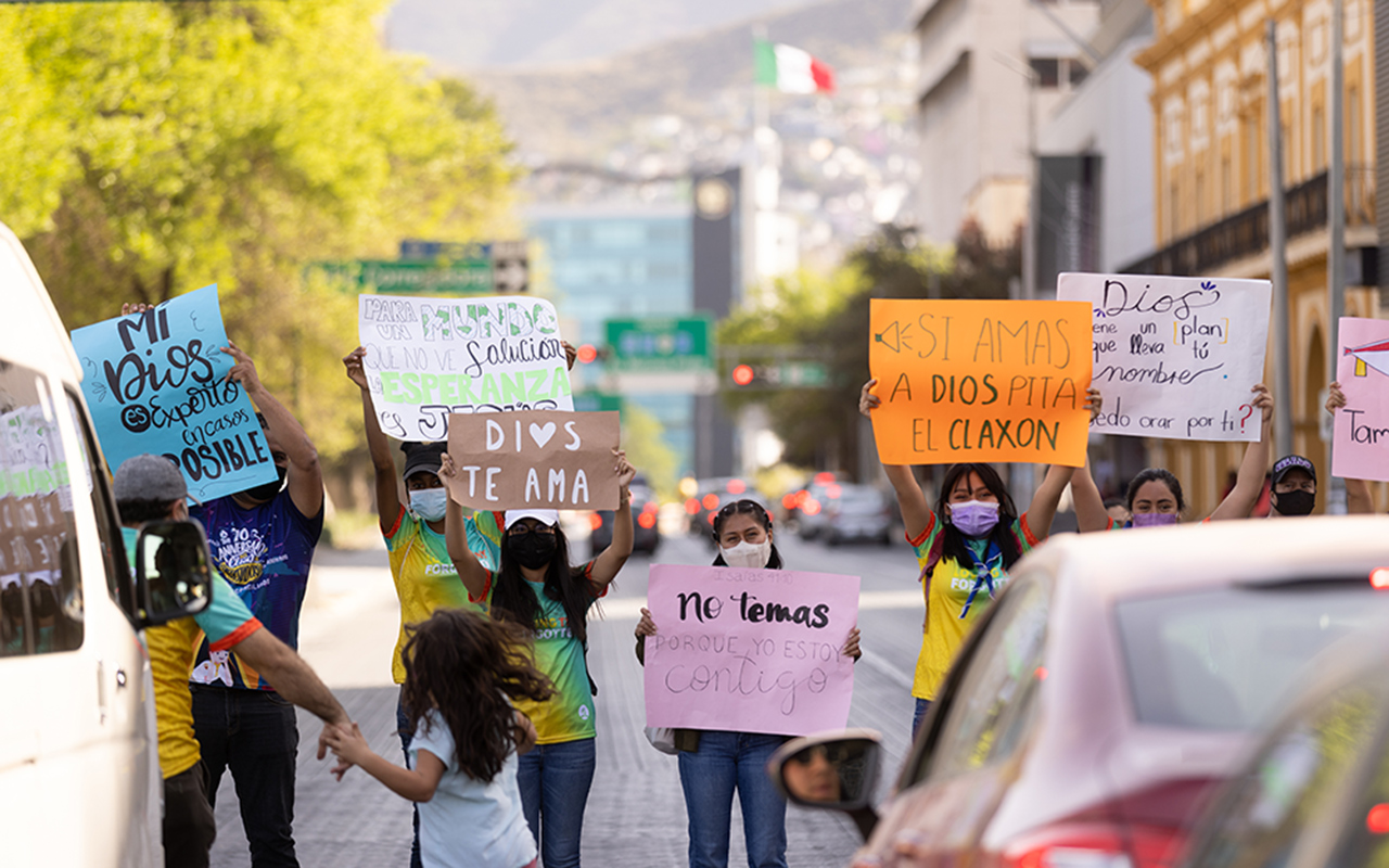 Young people from Doulos Pathfinder Club of Montemorelos University, hold up signs for drivers to read while the stop lights came on at the Ignacio Zaragoza street in the historic sector of Monterrey, Nuevo Leon, Mexico, during the stop during Global Youth Day on Mar. 19, 2022. Sings reads “God loves You”, “My God is an expert of the impossible”, “Fear not, Because I am with you”, “God has a plan that carries your name.” [Photo: Daniel Gallardo]