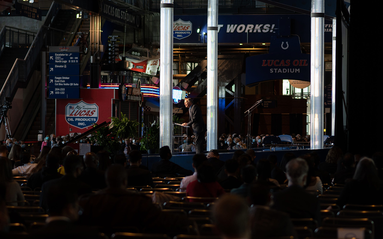 International evangelist Mark Finley preaches to the 2022 Pathway to Health volunteers, on the second-floor open auditorium of the Lucas Oil Stadium in, in Indianapolis, Indiana, United States. He said that the ultimate great goal of the initiative is to reveal the living DChrist to people who come looking for health. [Photo: Samuel Girven]