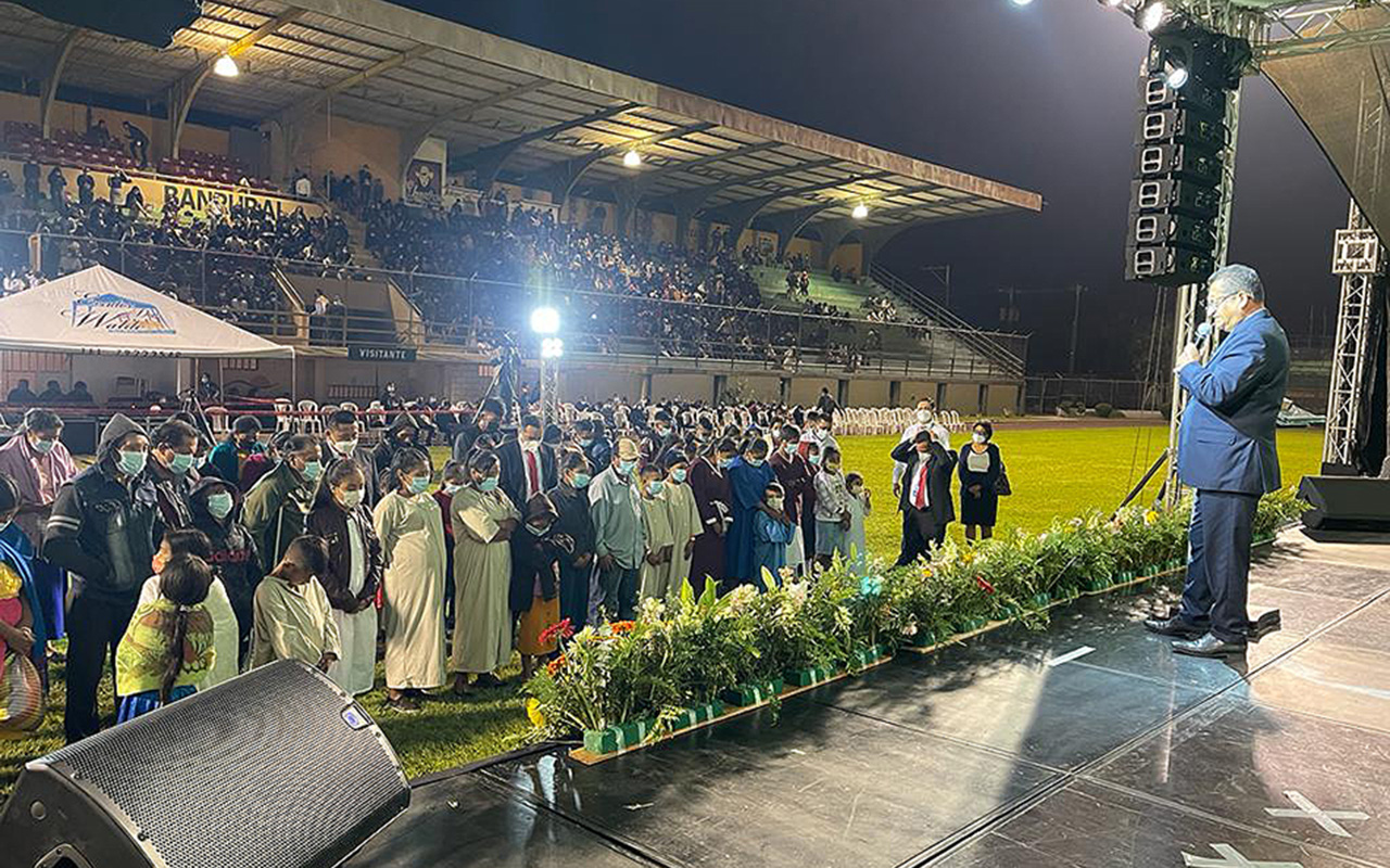 Pastor Melchor Ferreyra, personal ministries director for the church in Inter-America and keynote speaker, makes an altar call during the evangelistic series at Las Florez Soccer Stadium in Jalapa, Guatemala, Apr. 8, 2022. The series took place across Central America and the Dominican Republic. [Photo: Miqueas Fortunato/IAD]