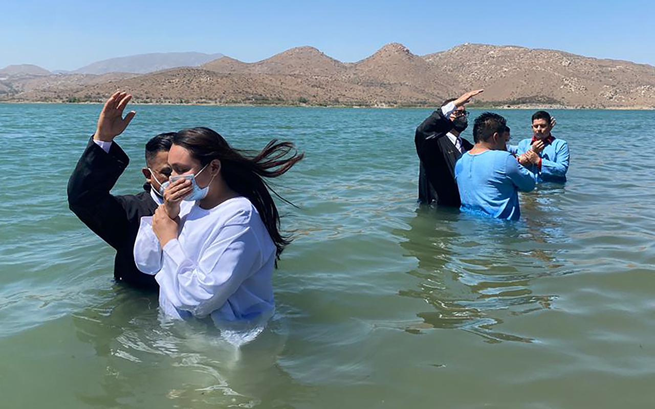 Several are baptized at the El Carrizo Damn in Valles de Tijuana in Baja California, Mexico. They were part of more than 23,000 new members baptized during online evangelistic series at the end of May as part of the ongoing efforts to leading to the national campaign held June 12-19, 2021. [Photo: Baja California Conference]
