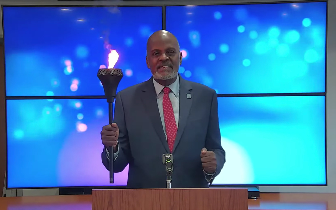 Inter-American Division President Pastor Elie Henry gets ready to pass the torch to Pastor Peter Kerr and his church leaders in the Atlantic Caribbean Union on July 2, 2022, during the launch of the “Centennial Gospel Caravan” which will seek to mobilize active church members to reach 800 unentered territories with the gospel this month.[Photo: IAD Screenshot]
