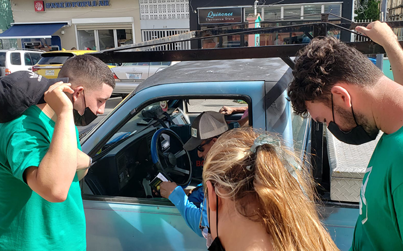 Adventist youth pray for a driver in Vieques, Puerto Rico, after handing him the missionary book this year entitled “Hope in the Midst of Chaos” by Mark Findley, during a Caleb Mission Project evangelistic impact initiative held on the island July 6-16, 2022. A group of young people took time during their vacation to travel to the small island on the eastern coast of Puerto Rico to clean streets, beaches, beautify parks and pray with government officials, community members and hold evangelistic efforts. [Photo: Puerto Rican Union]