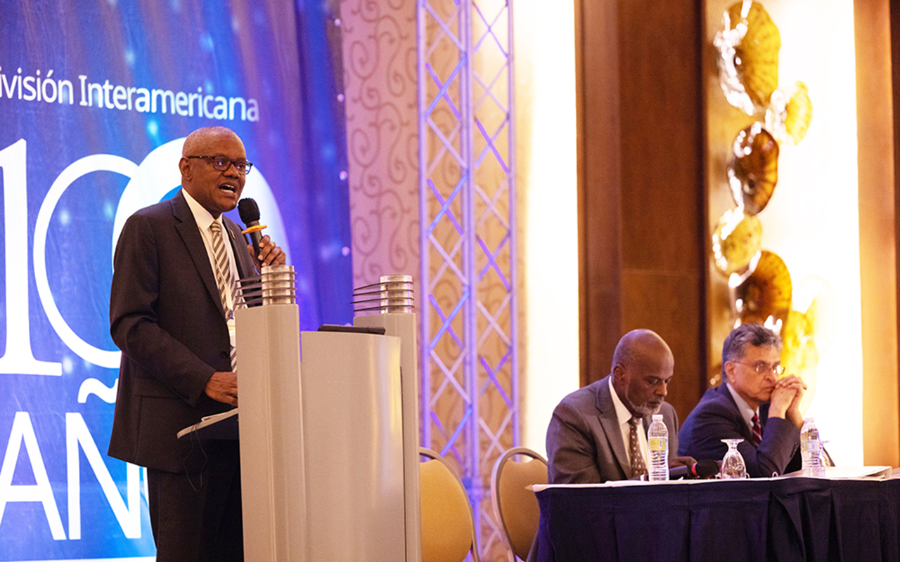 Pastor Leonard Johnson, executive secretary of the church in Inter-America, presents his annual report during day one of the Year-End Executive Committee Meetings on Oct. 30, 2022, in Punta Cana, Dominican Republic. The meeting is the first in-person annual meetings held since before the pandemic in 2019. [Photo: Daniel Gallardo/IAD]
