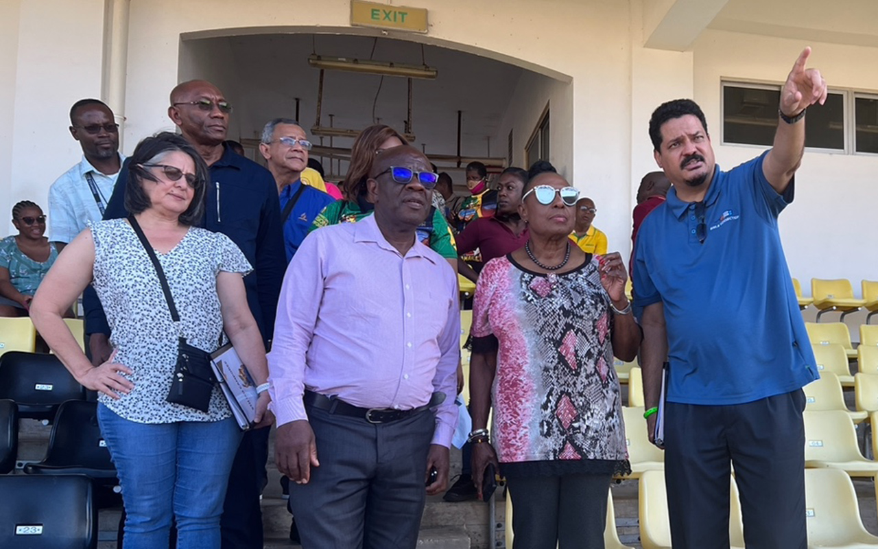 Pastor Al Powell(right), IAD youth ministries director, gives Hon. Olivia “Babsy” Grange (second from right), Minister of Culture, Gender, Entertainment and Sports and Mayor of Falmouth, Councilor Collen Gager an idea of the set up for the Trelawny Multipurpose Stadium, Jamaica, during a tour of the facilities Feb. 24, 2023. Others looking on from L-R Pastor Jermaine Bailey, youth ministries director of the West Jamaica Conference, Liza Liza Christian, IAD associate treasurer,Pastor Balvin Braham (left second row ), IAD vice president and Tony De La Mota, IAD associate treasurer. [Photo: Nigel Coke]