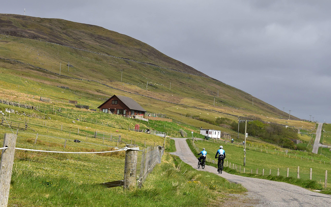 Members of the I Will Go cycling team ride on a one-lane back road in the Shetland Islands on May 16, looking to connect and pray with people and distribute Adventist literature. [Photo: Marcos Paseggi, Adventist Review]