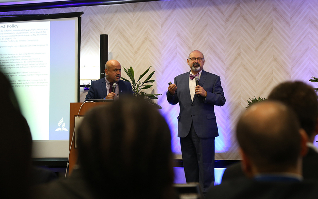 More than 400 IAD church leaders listen to Karnik Doukmetzian (right), General Counsel for the General Conference on conflict of interest, in Miami, Florida, United States, for the annual Segment Leadership Development Conference, while hundreds more took part virtually. [Photo: Libna Stevens/IAD]