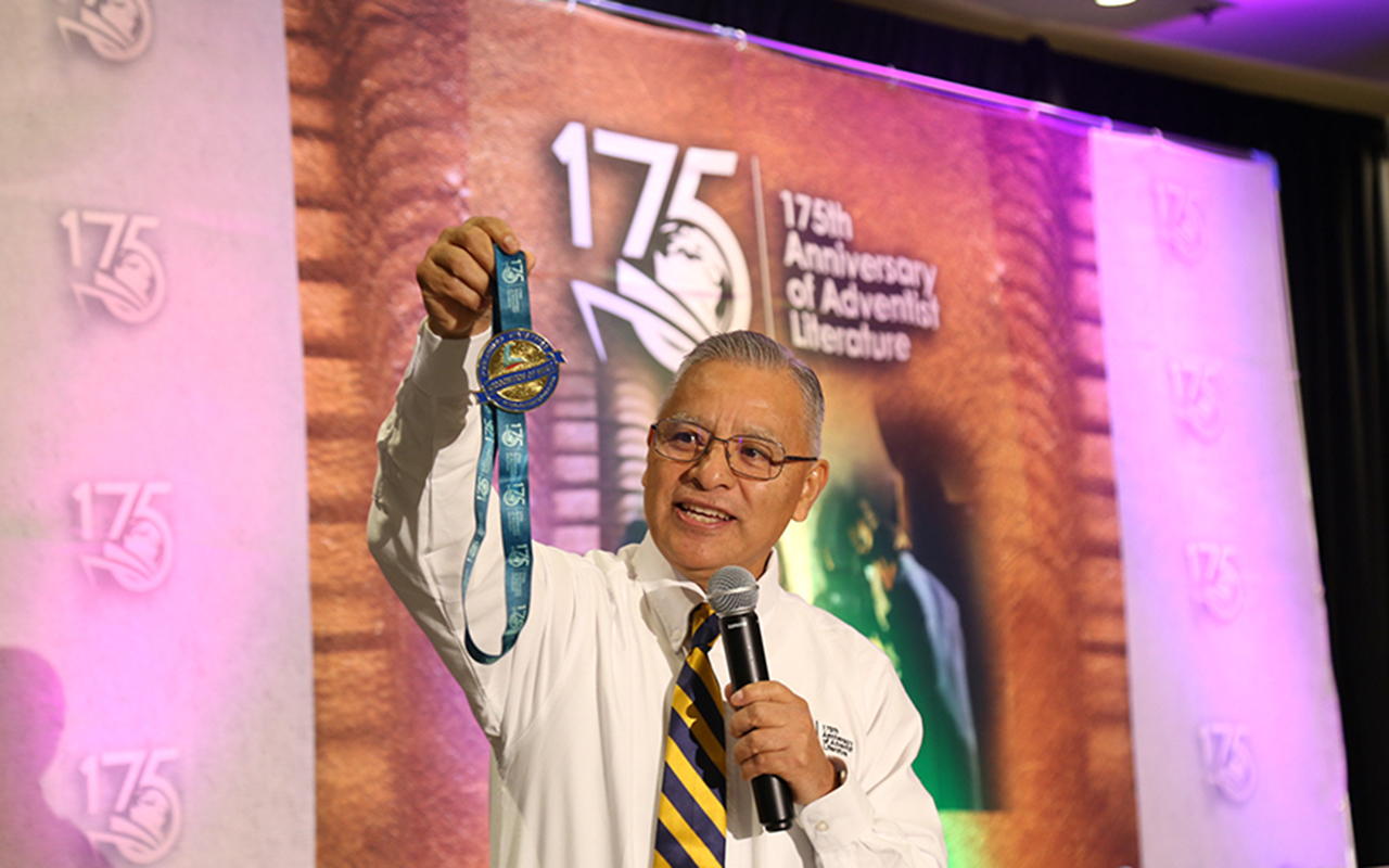 Pastor Isaías Espinoza, publishing ministries director of the Inter-American Division, shows the IAD commemorative medal in celebration of the 175th Anniversary of Adventist Literature around the world during a special ceremony on Oct. 26, 2023, in Miami, Florida, United States. The medal was awarded to Adventist university board leaders who have an active student literature evangelism program on their campuses. [Photo: Libna Stevens/IAD]