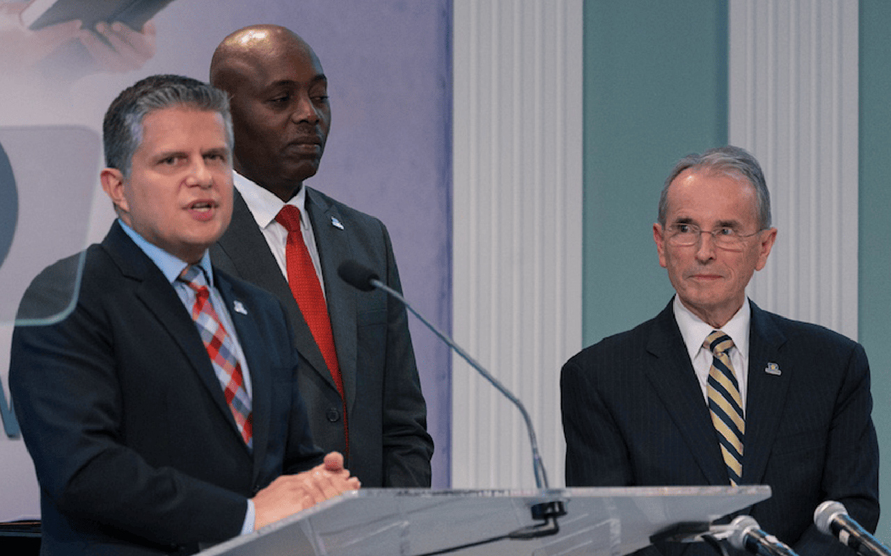 Hope Channel president-elect Vyacheslav Demyan (left) presents the organization’s report as vice president for finance Gideon Mutero (center) and retiring president Derek Morris look on. [Photo: Lucas Cardino / AME (CC BY 4.0)]