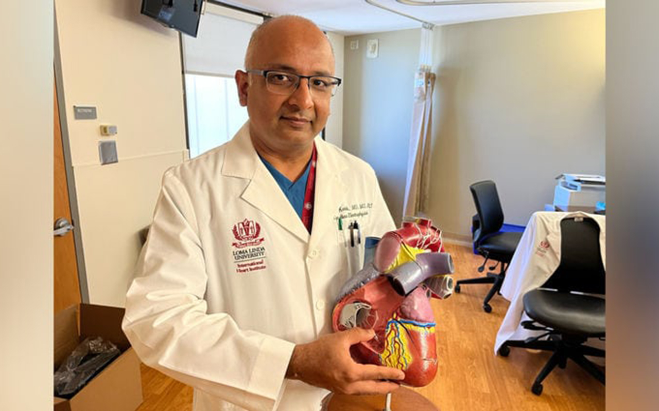 Cardiac electrophysiologist Kamal Kotak demonstrates where a leadless pacemaker would be inserted into the human heart. [Photo: Loma Linda University Health News]