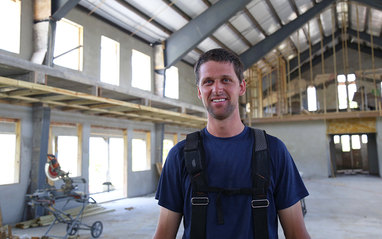 Abraham Schrock, a Seventh-day Adventist construction company owner from Ohio, United States, smiles on his last day helping build the framing at Peter’s Rest Seventh-day Adventist Church in St. Croix, on Apr. 11, 2024. Schrock traveled recently to the island for free as soon as he found out the Adventist Church was still undergoing rebuilding efforts after a fire in 2020 damaged the structure. [Photo: Libna Stevens/IAD]