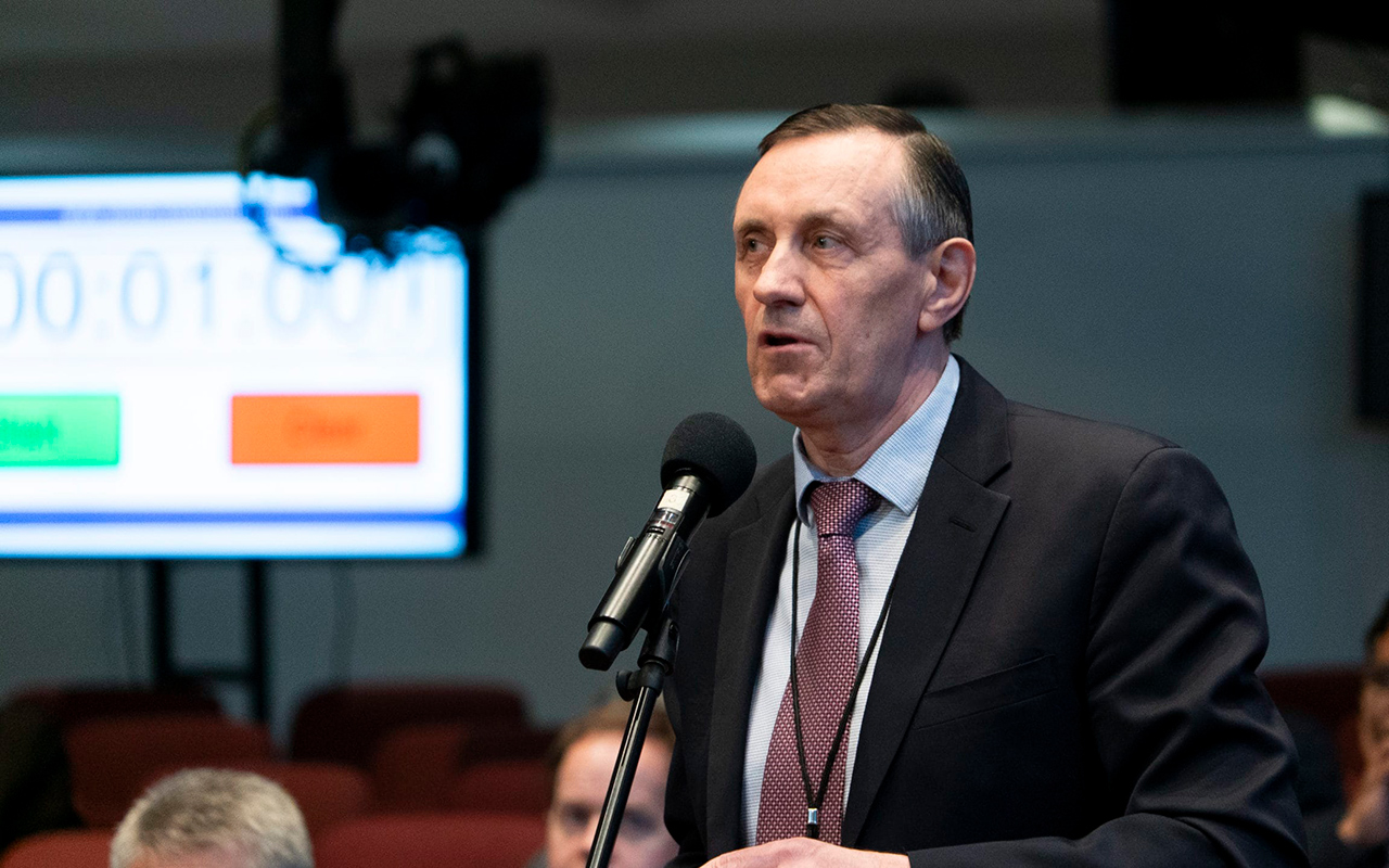 Mikhaul F. Kaminskiy, president of the Euro-Asia Division, shares his perspective during the discussion on Wednesday, April 10, at the General Conference Spring Meeting. [Photo: Enno Müller, Adventist Review]