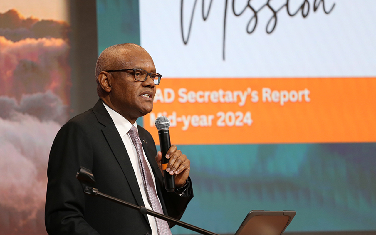 Pastor Leonard Johnson, executive secretary of the Inter-American Division presents his report at the start of the church’s Mid-year Executive Committee business meetings, in Miami, Florida, United States, May 6, 2024. [Photo: Libna Stevens/IAD]