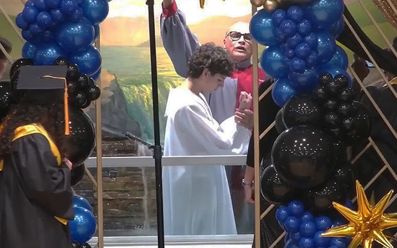 Pastor Héctor Reyes, president of the South Puerto Rico Conference, prays for Amir J.Nuñez, age 18, before baptism during the graduation ceremony on May 23, 2024, in Ponce, Puerto Rico. Amir made the decision to get baptized days before his graduation and wanted to make sure to do at the Dr. Dennis Soto Adventist Academy where he fell in love with the Bible at 12 years old. [Photo: Dr. Dennis Soto Adventist Academy]