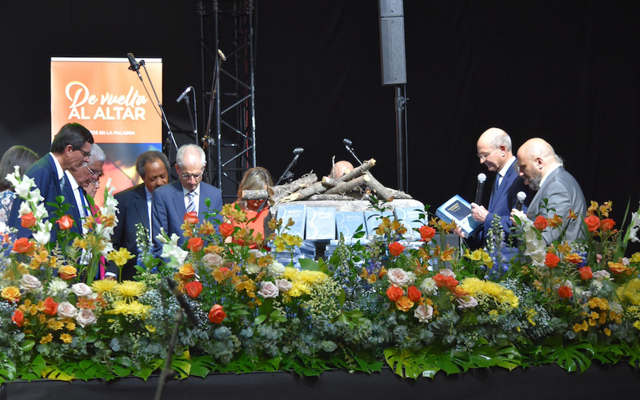 Safeliz publishing house leaders introduce the new Maranatha Study Bible during the Spanish Union of Churches Conference on June 15. [Photo: Marcos Paseggi, Adventist Review]
