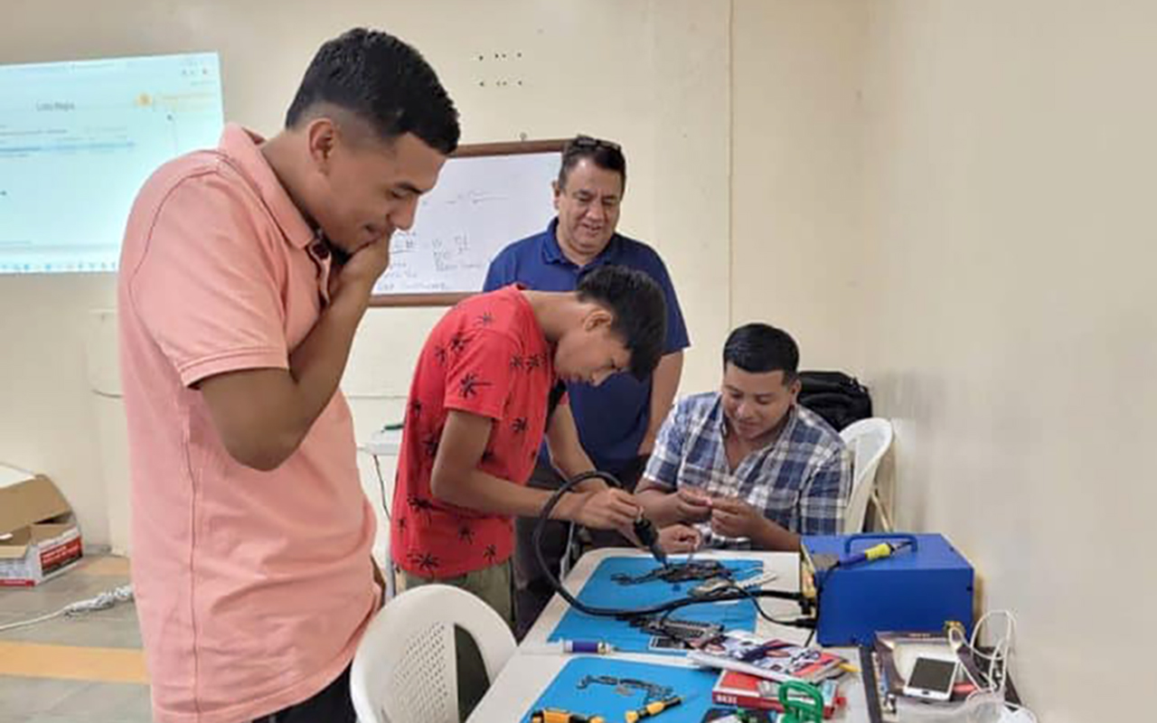 Young people from La Victoria Community, in Honduras, get hands-on experience repairing mobile phones thanks to an ADRA and USAID’s Bureau for Humanitarian Assistance (BHA) vocational workshop project that helps them better support themselves. [Photo: ADRA Honduras]