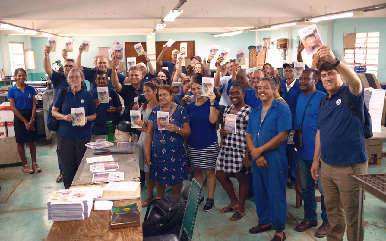 Members of the General Conference Secretariat team and local church leaders smile and cheer after completing the binding of Mission quarterlies at the Cuba Union Conference printing shop near Havana, Cuba, on July 30. [Photo: Ashton Weiss, Maranatha Volunteers International]