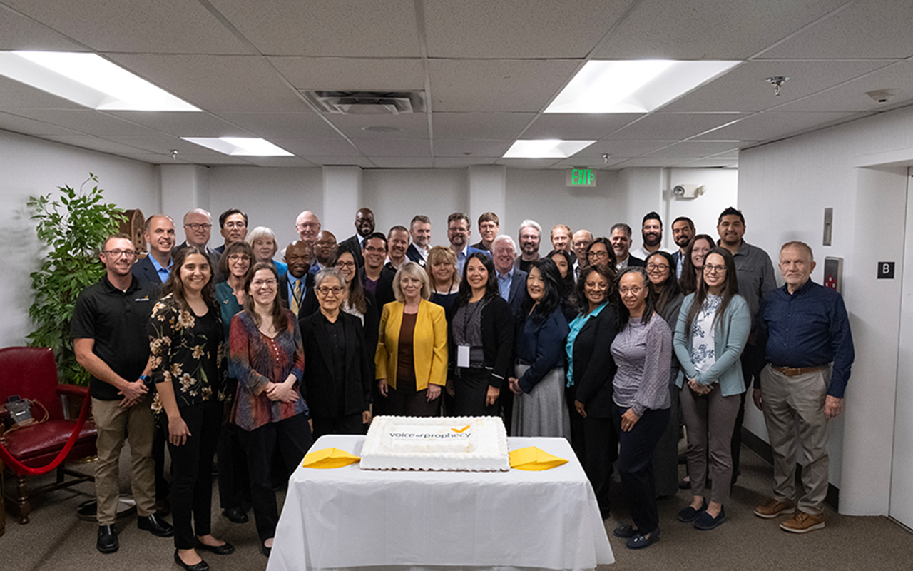 The Voice of Prophecy team gathers with its executive committee to celebrate the ministry’s 95th birthday. [Photo: Voice of Prophecy]