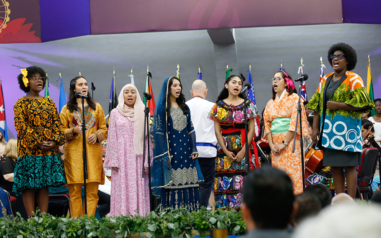 A group of Montemorelos University students sing during the opening of Inter-American Division’s Year-End Executive Committee Meetings focused on “All the Family in Mission” efforts on Sabbath, Nov. 9, 2024, from Montemorelos, Nuevo Leon Mexico. [Photo: Libna Stevens/IAD]