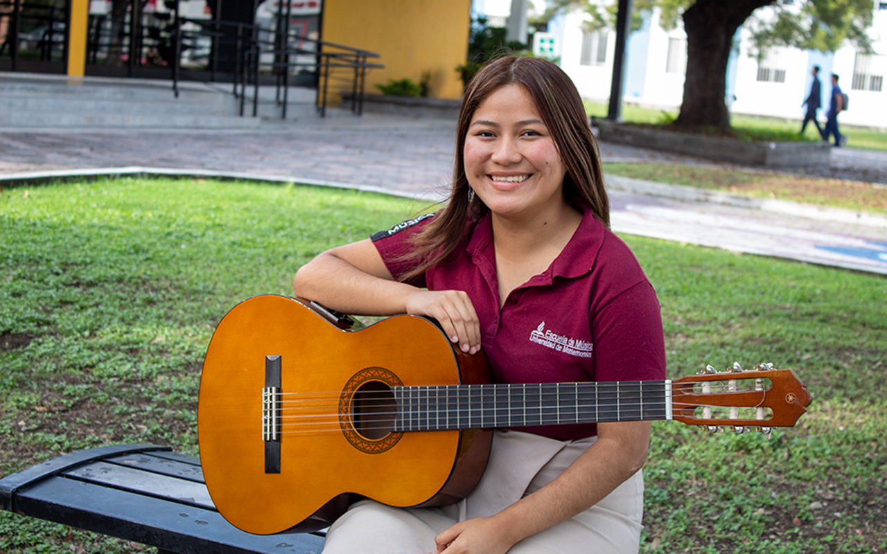 Alexa Romero sits with her guitar recently on campus at Montemorelos University, Mexico. [Photo: Lisandra Vicente/Montemorelso University]