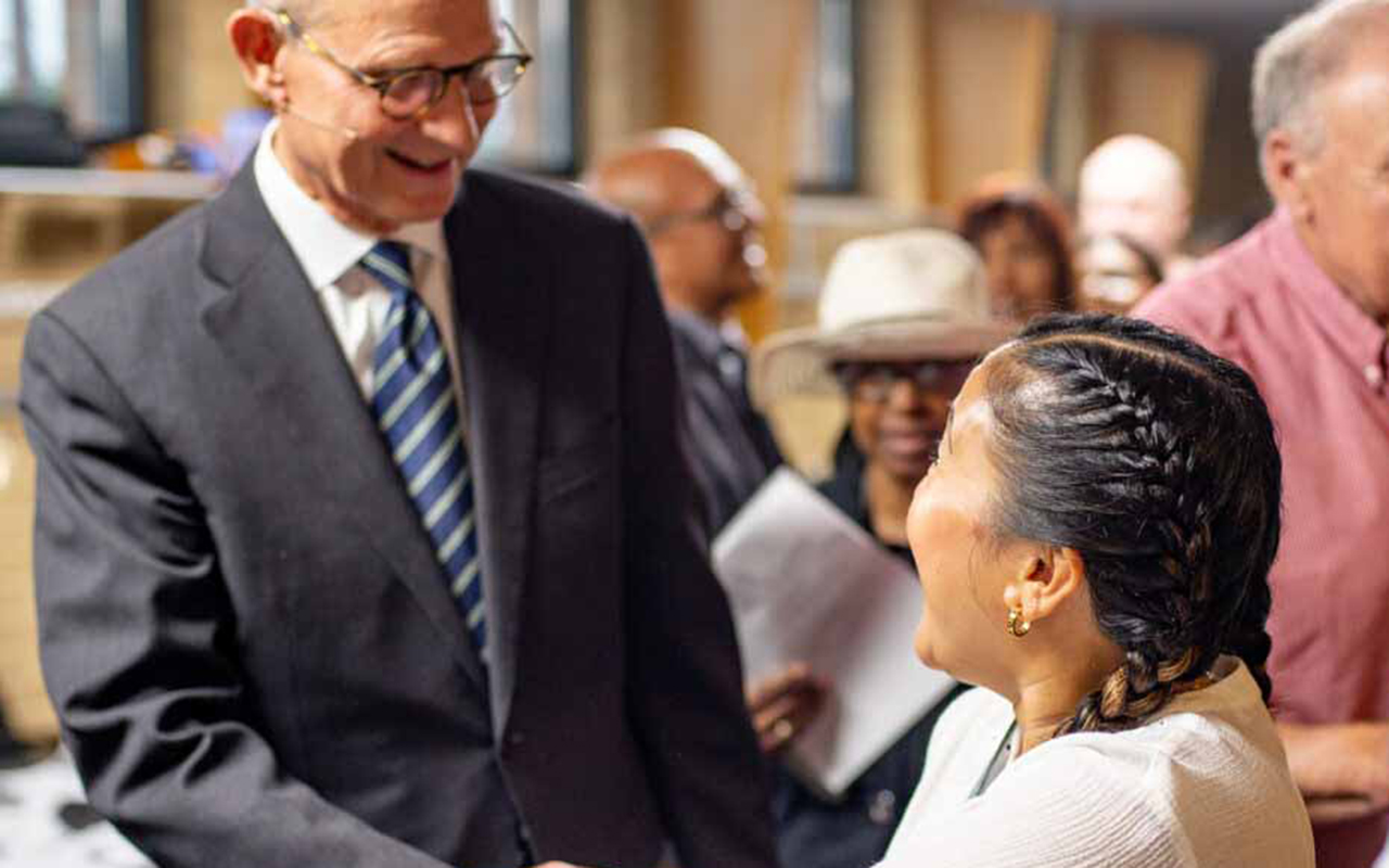 Ted N. C. Wilson, General Conference president, greets an attendee to the Revelation of Hope series at the St. Louis Central Seventh-day Adventist Church in late June. [Photo: Bernard Morris]