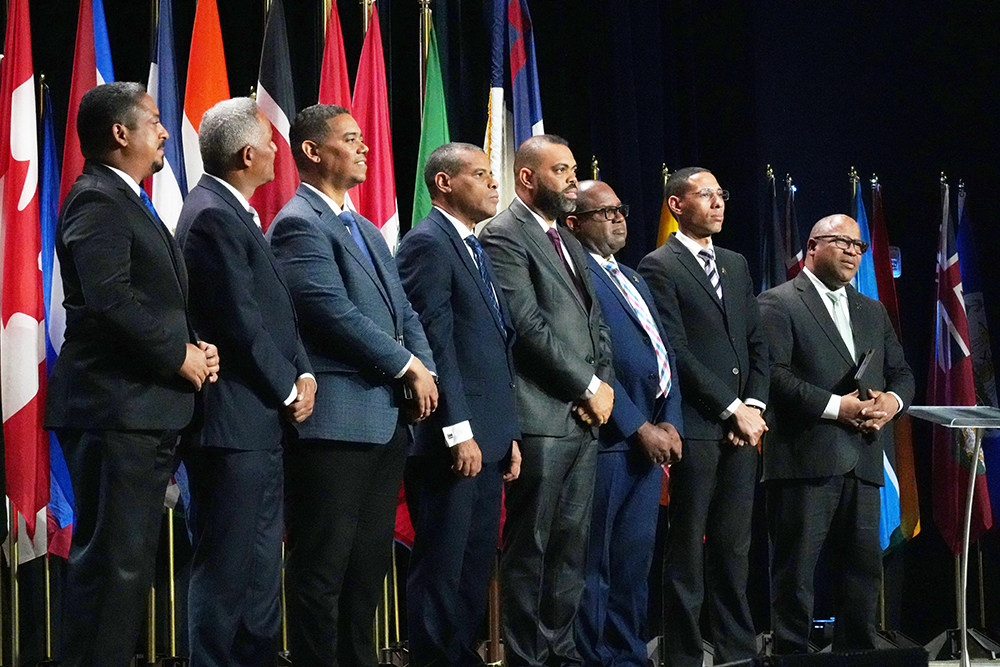 Regional church leaders from the Dominican Republic stand on the stage during the 2025 Maranatha Volunteers International convention in Sacramento, California, United States, September 20. [Photo: Marcos Paseggi, Adventist Review]