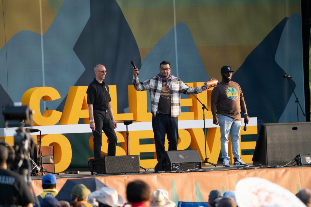 The North American Division Youth and Young Adult Ministries One Team (left to right): director Tracy Wood, associate director Armando Miranda, Jr., and Vandeon Griffin greet attendees to the 2025 Master Guide Camporee. [Photo: Art Brondo]