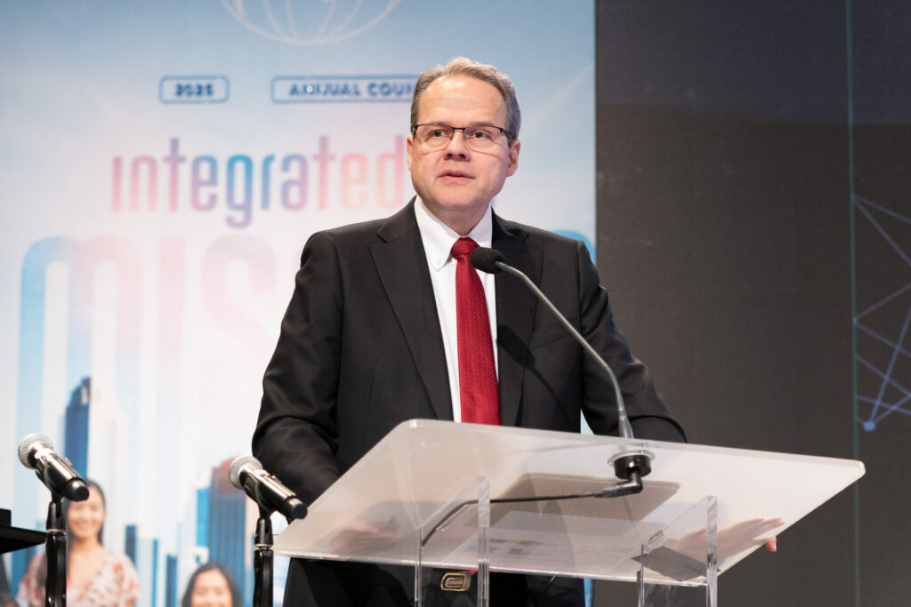 Paul H. Douglas, General Conference treasurer, shares the three areas of emphasis for this quinquennium during the 2025 Annual Council. [Photo: Peterson Fagundes]