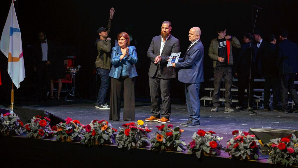 Dr. Cristina González (left), founder and president of the World Values Forum, presents a recognition award to the Montemorelos University School of Music, received by professors Óscar Castillo (center) and Pavel Semanivsky (right). [Photo: Lisandra Vicente/UM]