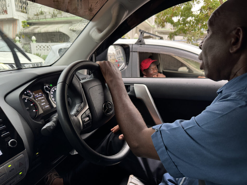 Pastor Glen Samuels, president of the West Jamaica Conference, speaks briefly with a church member during a survey and relief drive in Westmoreland Parish on Nov. 2, 2025. [Photo: Libna Stevens/IAD]