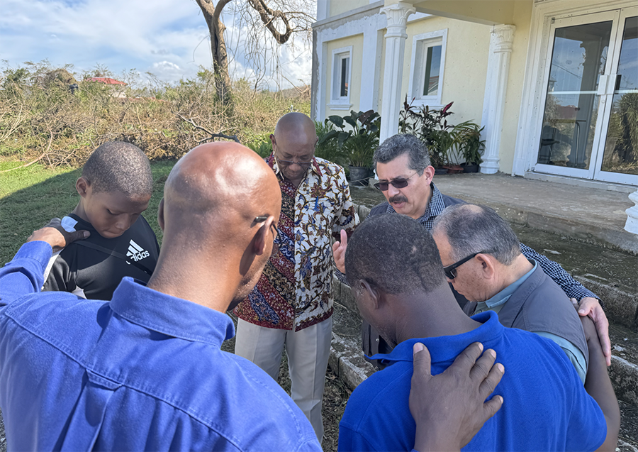 IAD leaders pray for victims of Hurricane Melissa by the entrance of the Discovery Bay Adventist Church in the northern coastal town of Discovery Bay, St. Ann, Jamaica, on Nov. 2, 2025. [Photo: Libna Stevens/IAD]