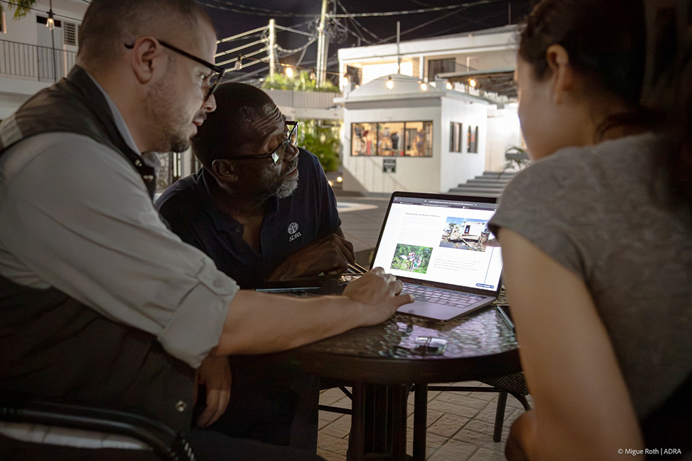 ADRA Emergency Response Coordinator Ruben Ponce (center) meets with Wenford Henry (second left), ADRA Jamaica director, and Alejandra López, ADRA programs officer, as they review ongoing relief operations at the agency’s hub in Mandeville, Jamaica. [Photo: Migue Roth/ADRA International]