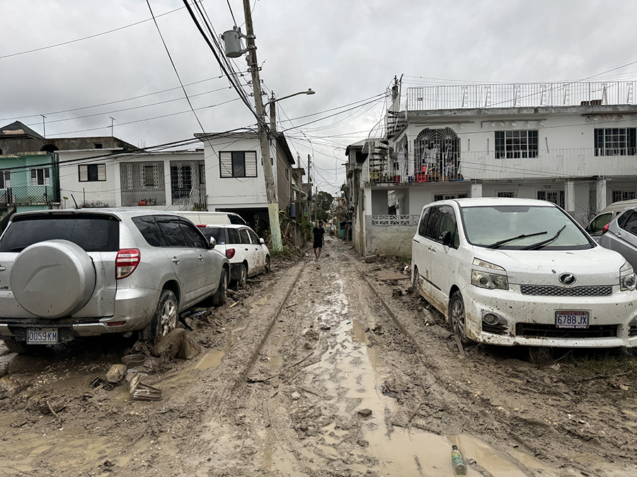 Heavy rainfall and severe flooding left streets in Westmoreland Parish, Jamaica, coated in mud and debris, with vehicles still stranded days after Hurricane Melissa struck, on Nov. 2, 2025. [Photo: Libna Stevens/IAD]